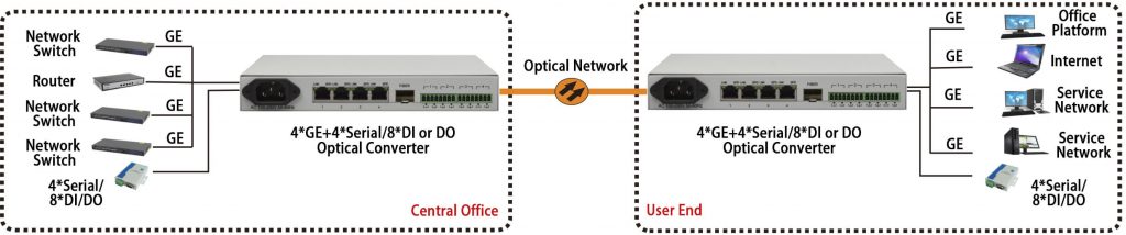 Simultaneously transmits 4 Gigabit Ethernet interfaces (sharing 1000M bandwidth) over a single optical fiber, along with 1-8 digital input/output interfaces and 1-4 RS232/422/485 interfaces; |