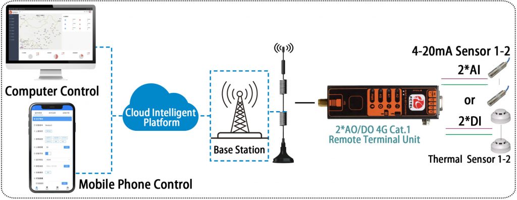 This 4G network-connected control unit integrates 2-channel AI/AO (analog input/output), allowing for external sensor data acquisition via self-polling. It can be connected to a touchscreen for local control and display, and can be integrated with our company’s cloud platform for remote control. It has been widely applied in various intelligent transformation fields, such as factory power distribution box monitoring, intelligent control of agricultural greenhouses, smart street lighting projects, sewage treatment, aquaculture, and livestock farming, among hundreds of other industry applications. It supports connection to customer servers via TCP, MQTT, HTTP, and other protocols.