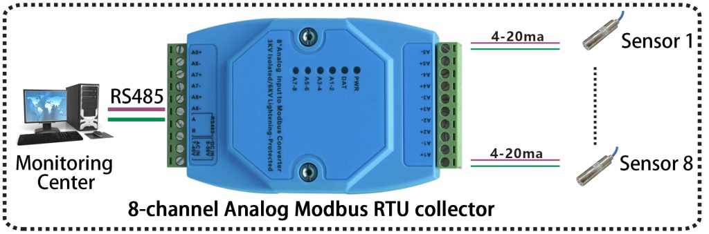 The 8-channel analog acquisition module can collect 8 analog input signals of four types: 0-20mA, 4-20mA, 0-5V, and 0-10V. The collected analog signal data is output through the isolated RS485 interface and can be controlled through the isolated RS485 interface. The signal acquisition and RS485 communication electrical signals are isolated from each other, effectively suppressing all types of cross-mode and common-mode interference, ensuring data accuracy and reliable operation of the module.